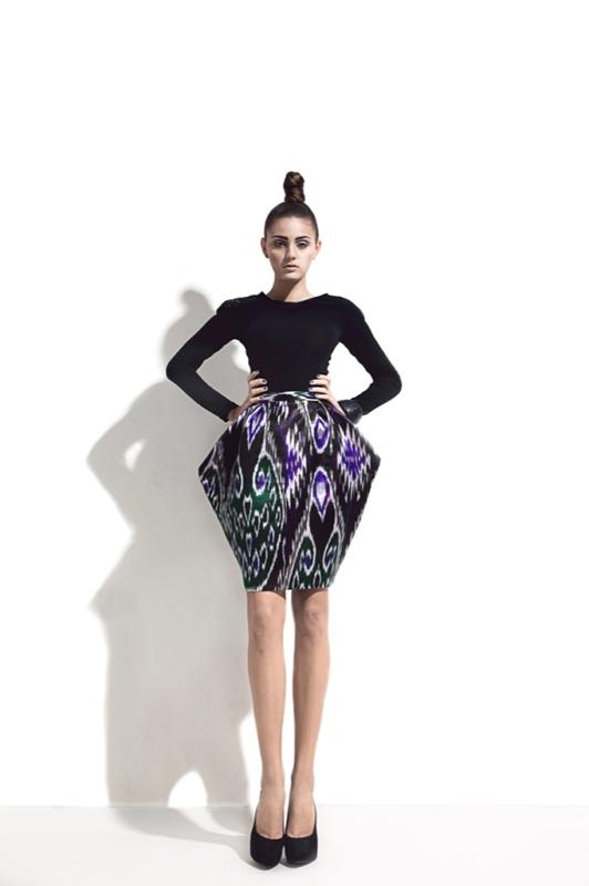 Inspired by Great Silk Road, the collection is mainly produced from an original ethnic Uzbek fabric - Khan Atlas, famous for its Ikat print. It plays with the borderline of East and West, mixing modern and ancient patterns, and ethnic and contemporary shapes. The designer Kamola Malikova’s Uzbek heritage shines through in her use of oriental motifs.