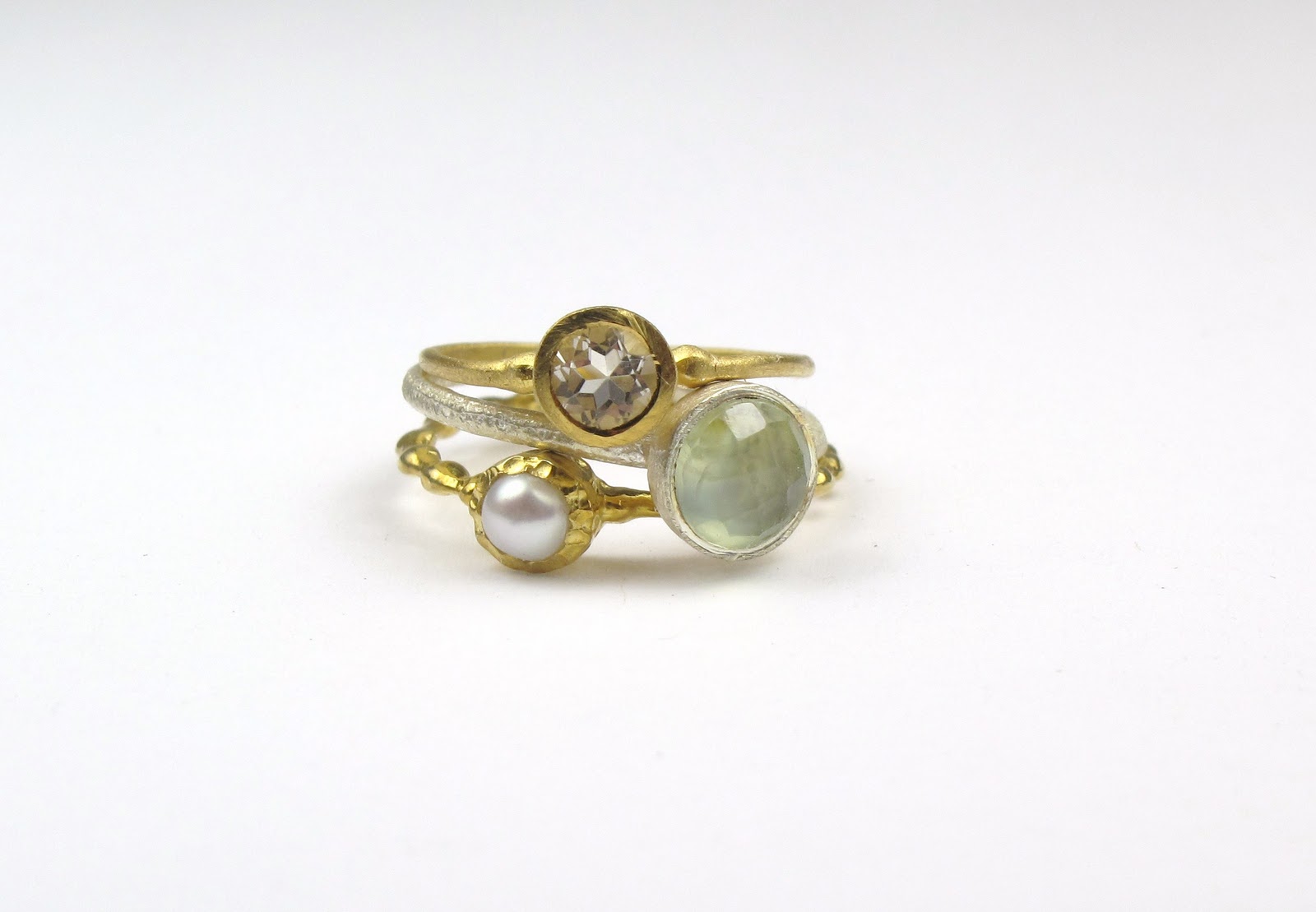 | Gold plate and smoky quartz ring, silver and phrenite ring, gold plate and pearl ring. £35 , £45 and £39 |