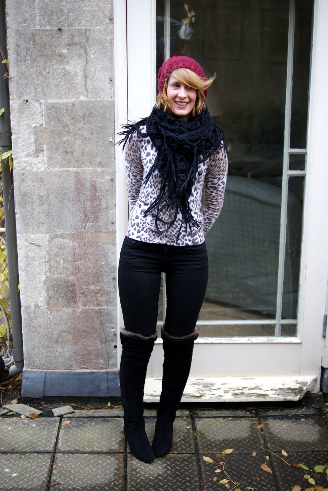 | Leopard cardigan - Oasis Scarf - H and M Hat - Gap Jeans - Donna Ida Boots - Duo |