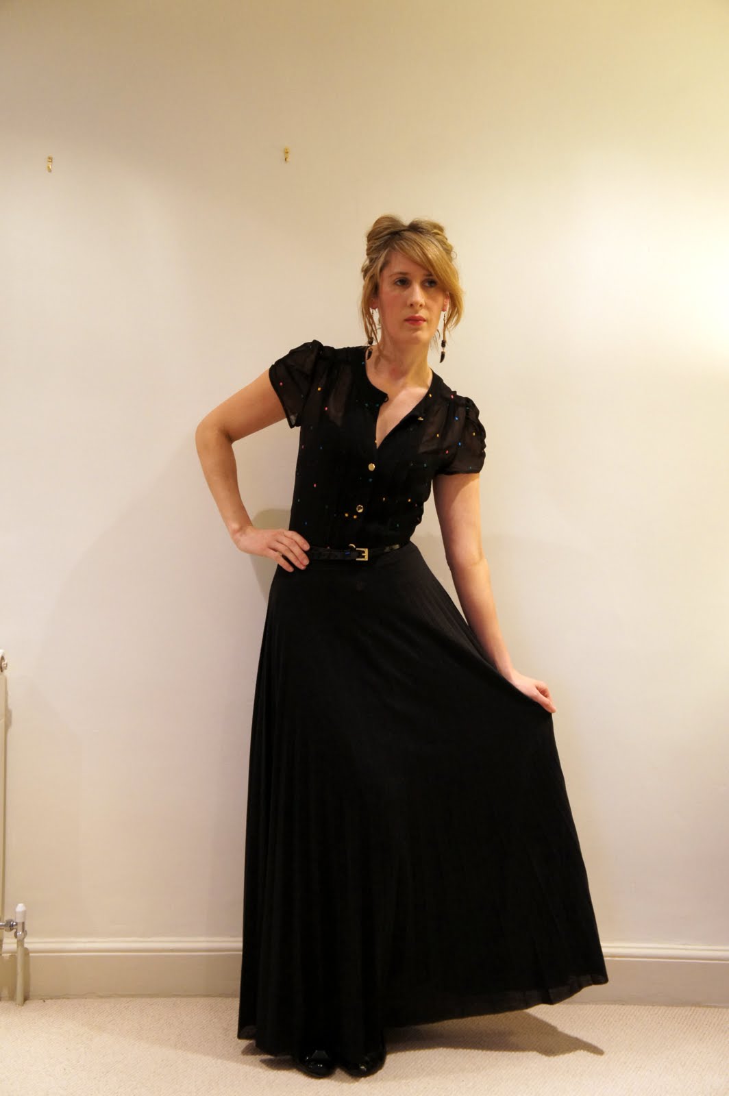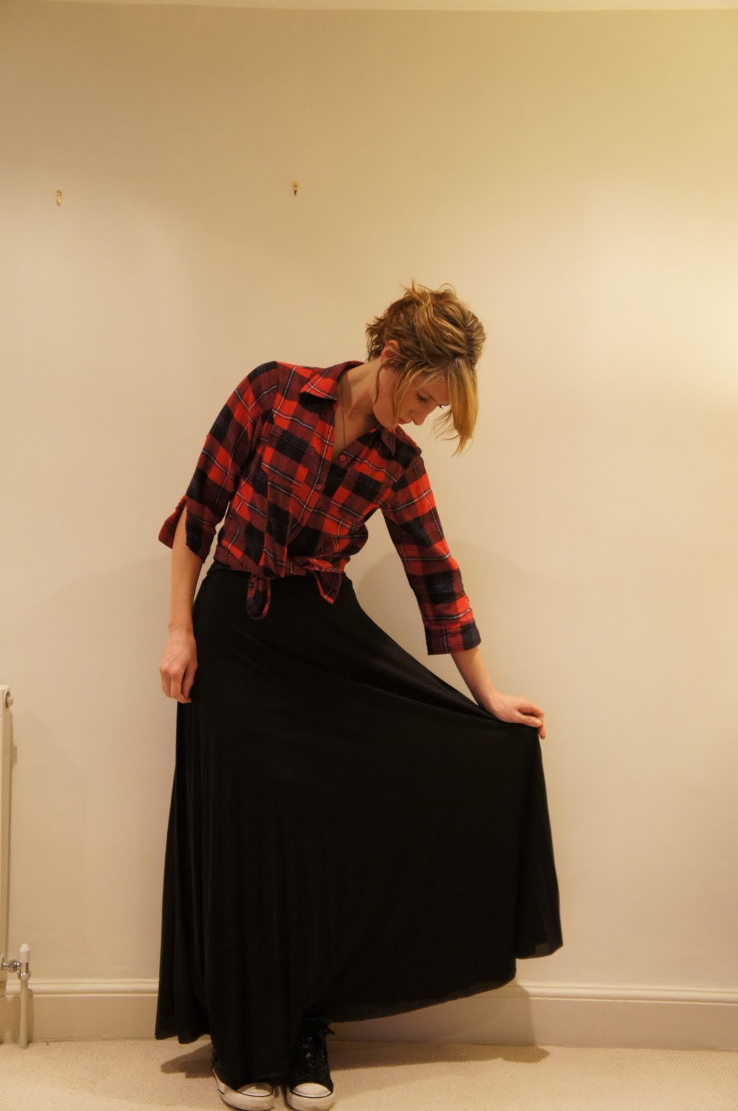 This is my first outfit and I think it’s my favourite. I’ve teamed it with an ancient cardigan of mine that’s seen better days (I just can’t make myself get rid of it), I breathed new life into it by wearing it back to front. I love the neckline on it worn this way, it broadens my narrow shoulders. I like to wear maxi skirts in a boho/grungy/rock kinda way, so to finished the look I combined the skirt with these studded boots and vintage belt.